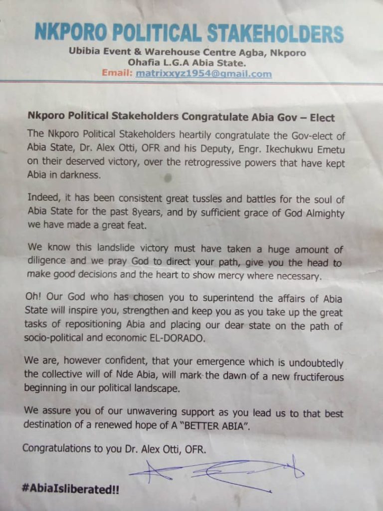 The Nkporo Political Stakeholders heartily congratulate the Gov-elect of Abia State, Dr. Alex Otti, OFR and his Deputy, Engr. Ikechukwu Emetu on their deserved victory, over the retrogressive powers that have kept Abia in darkness.