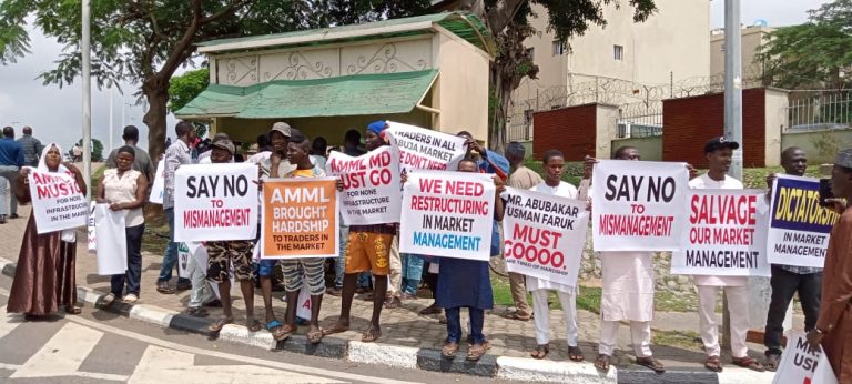 Some traders, on Thursday, staged a protest at the entrance of the Federal Capital Territory Administration office over the management crisis in the Abuja Market Management Limited.