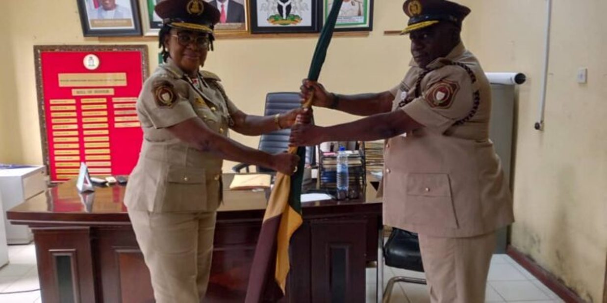 A photograph accompanying the statement shows Comptroller Ebegbune receiving the official flag of the command from his predecessor, Mrs. Nwosu.
