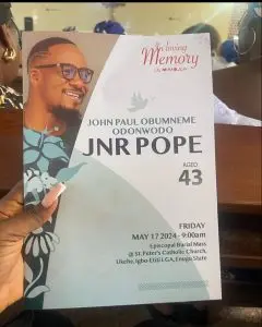 The funeral service for the late Nollywood actor, John Odonwodo, popularly called Junior Pope, has commenced at St. Peter’s Catholic Parish, Ukehe, in Enugu State.