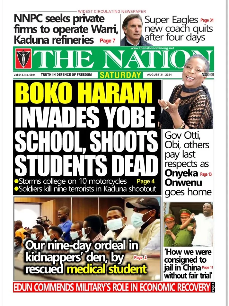 The Nation reports that suspected Boko Haram terrorists attacked an Islamic school in Geidam in Yobe state and killed three students. The newspaper says the Nigerian National Petroleum Company (NNPC) Limited is seeking to engage credible companies to operate and maintain the Warri and Kaduna refineries.
