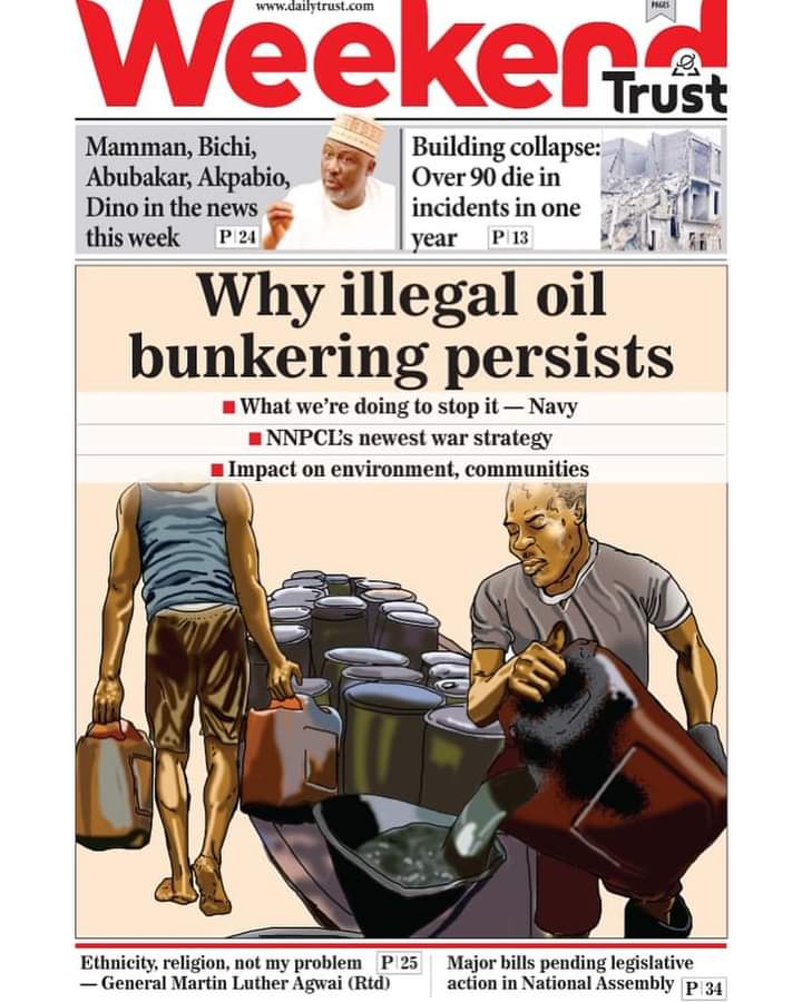 Daily Trust’s cover page focuses on why the trend of illegal oil bunkering persists in the Niger Delta despite the efforts of the federal government. The newspaper says over 90 people have died from incidents of building collapse across the country in one year.