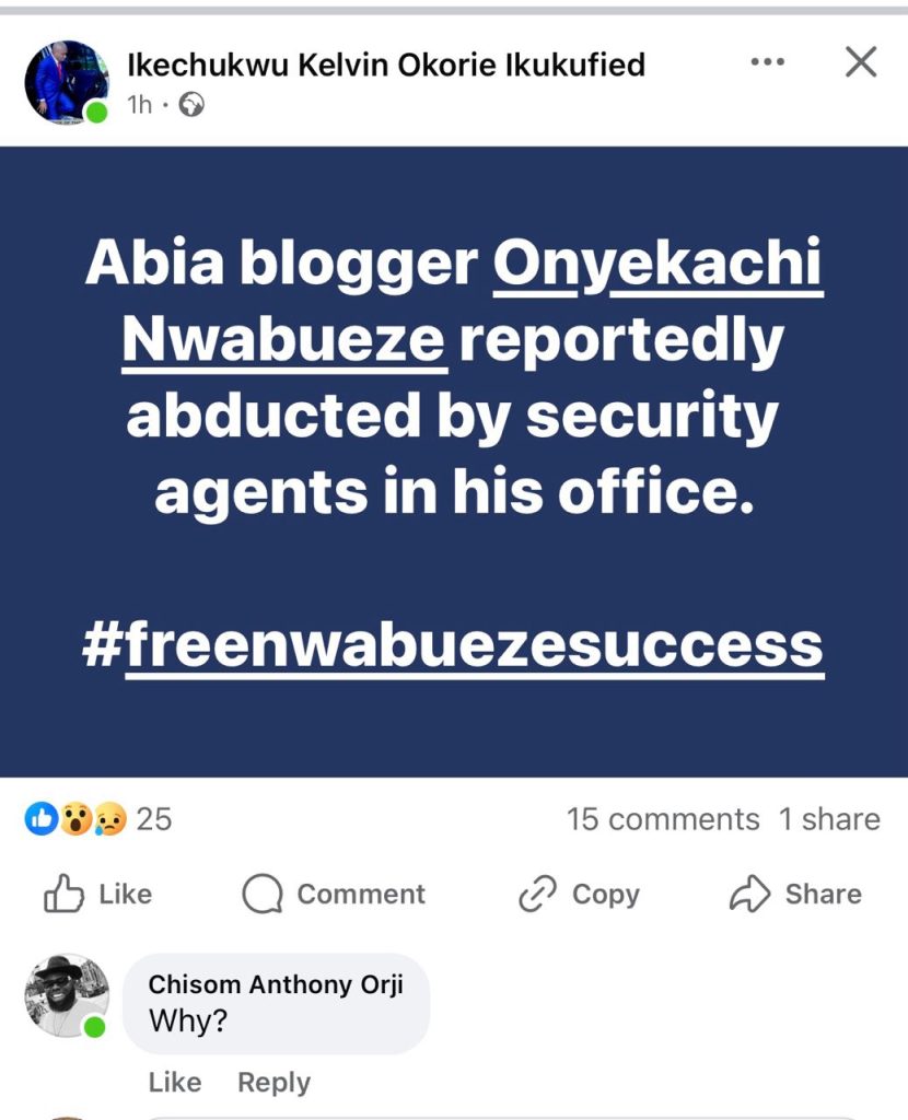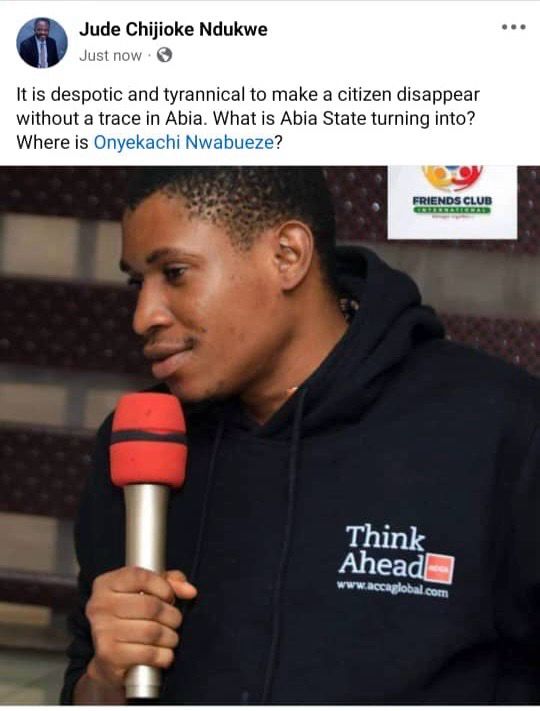 Jude Chijioke Ndukwe, a friend of Onyekachi, took to Facebook to condemn the situation, calling it “despotic and tyrannical” for a citizen to disappear without a trace. “What is Abia State turning into? Where is Onyekachi Nwabueze?” he questioned in his post.