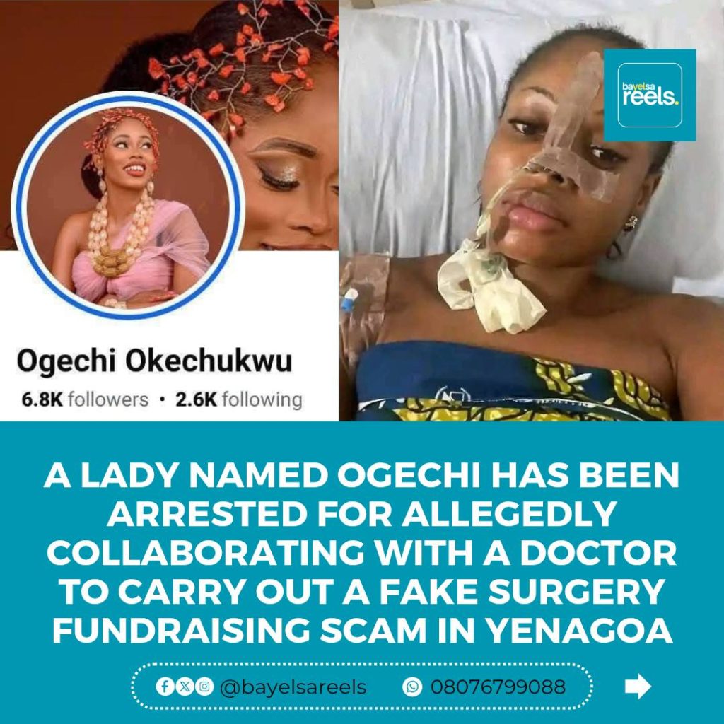 A woman identified as Ogechi Okechukwu has been arrested in Yenagoa, Bayelsa State, for allegedly orchestrating a fraudulent medical fundraising scheme in collaboration with a doctor.