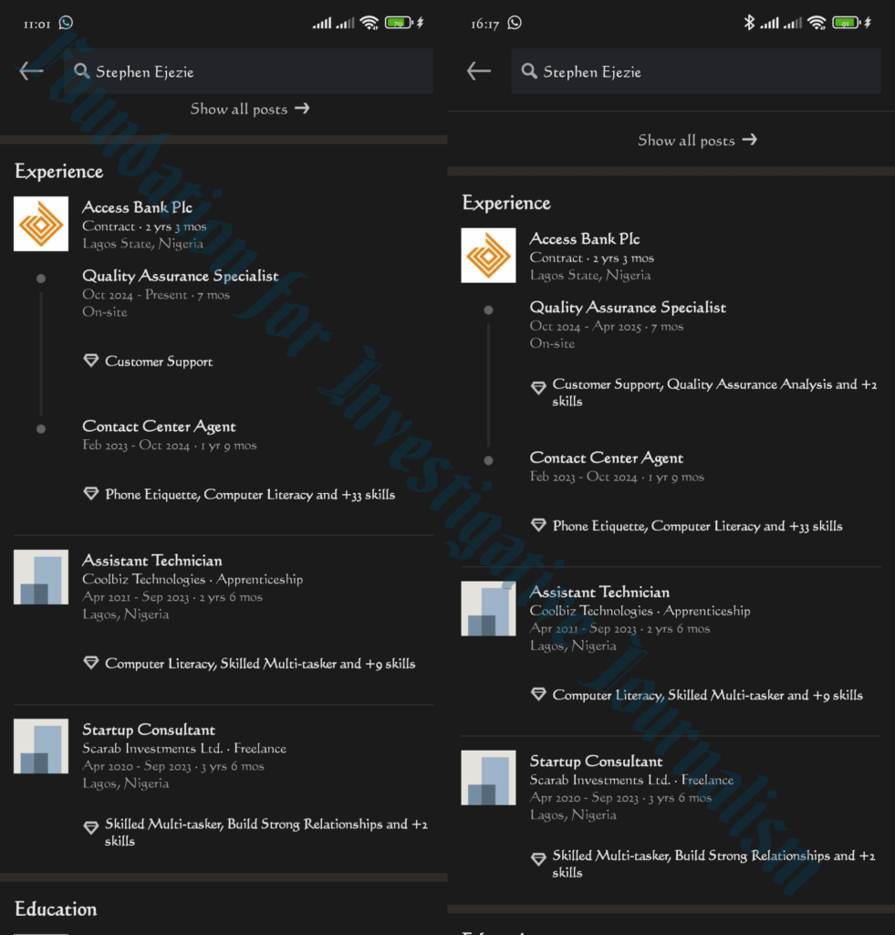 Screenshots captured by investigators revealed that as of Friday morning, April 25, Ejezie’s LinkedIn profile still listed Access Bank as his employer before it was swiftly edited to show otherwise within hours. Insiders disclosed that he had joined the bank in February 2023 and was promoted to quality assurance specialist just eight months later in October 2023.