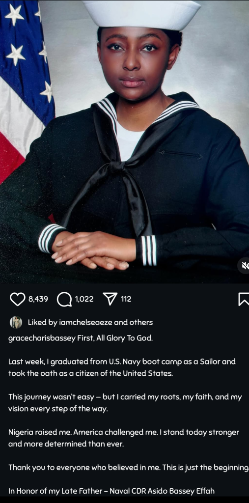 Nigeria raised me. America challenged me. I stand today stronger and more determined than ever, she wrote. She dedicated her milestone to her late father, Naval Commander Asido Bassey Effah, describing him as the inspiration behind her decision to serve in the military. Her tribute has touched thousands, resonating with those who knew her story both on and off screen.