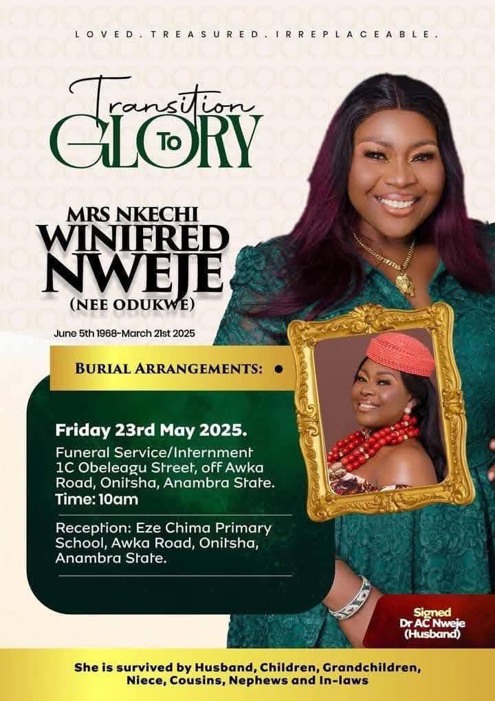Nollywood has been thrown into mourning once again as the family of late veteran actress Nkechi Nweje announces that her burial will take place on Friday, May 23, 2025, in her hometown in Anambra State. The revered actress passed away on March 21, 2025, at the age of 57, after battling an undisclosed illness.