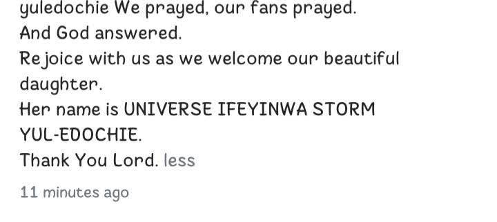 The proud father took to his verified platforms with an emotional post: “We prayed, our fans prayed. And God answered. Rejoice with us as we welcome our beautiful daughter. Her name is UNIVERSE IFEYINWA STORM YUL-EDOCHIE. Thank You Lord.” The couple shared a serene photo of mother and child, glowing in a moment of divine gratitude.