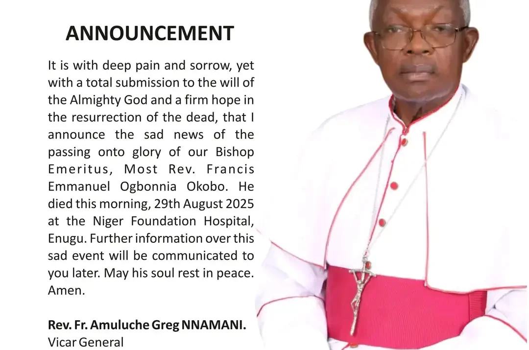 The Catholic community in Nsukka and beyond was thrown into mourning on Friday following the death of Bishop Emeritus of Nsukka Diocese, Most Rev. Dr. Francis Emmanuel Ogbonna Okobo. The revered cleric passed away in the early hours of August 29, 2025, at the age of 89.