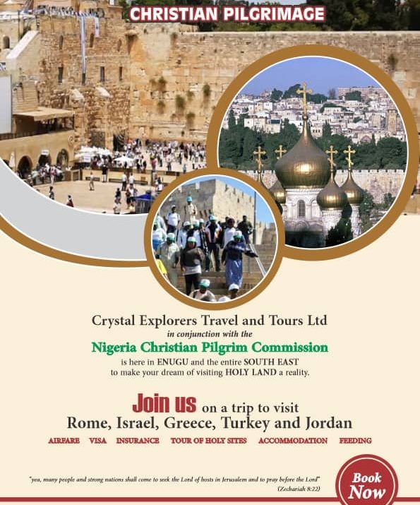 Christians in Enugu and across the South East now have a unique chance to visit some of the world’s most revered Christian sites this Christmas season, thanks to a subsidised pilgrimage package unveiled by Crystal Explorers Travel and Tours Ltd in partnership with the Nigeria Christian Pilgrim Commission (NCPC).
