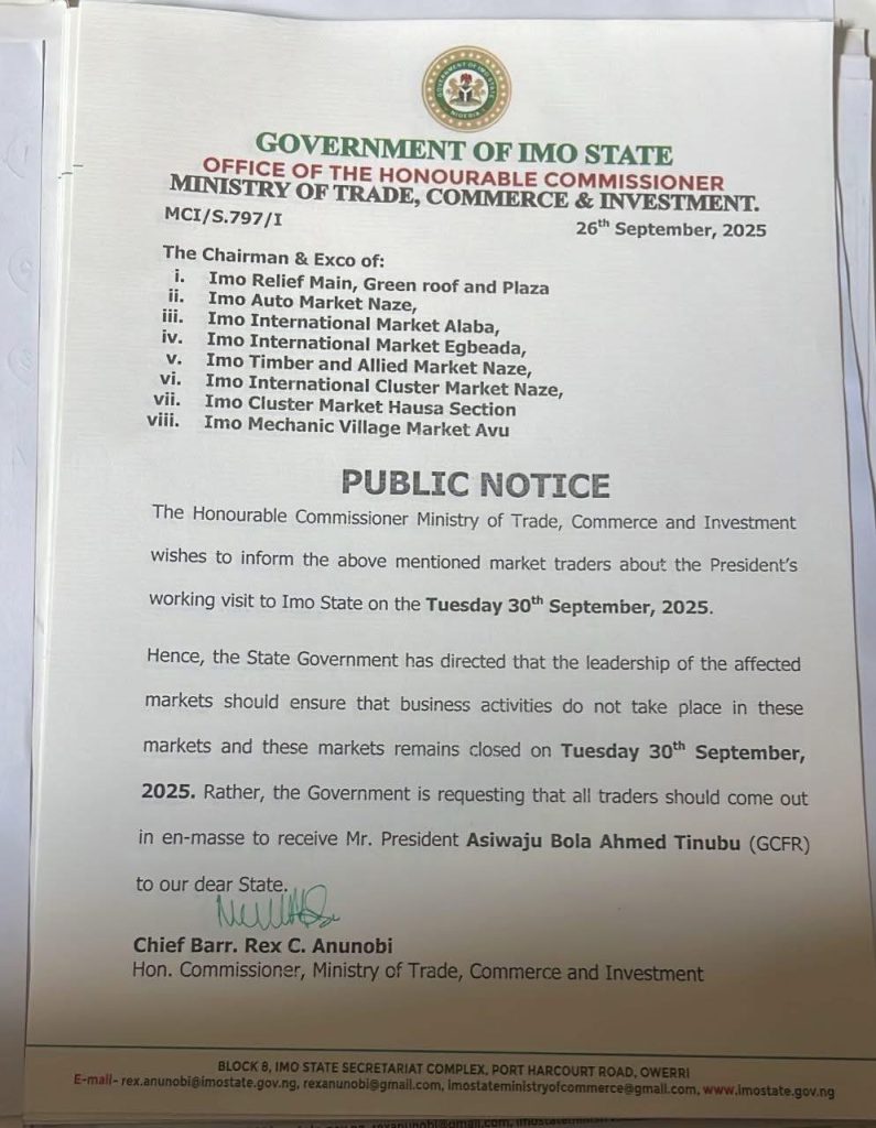 In a public notice dated 26 September and signed by the Commissioner for Trade, Commerce and Investment, Chief Barr. Rex C. Anunobi, the state instructed the leadership of eight large markets – including Relief Market, Imo Auto Market Naze and the Mechanic Village Market Avu – to ensure all business activities cease on Tuesday 30 September, when the President is due in Owerri.