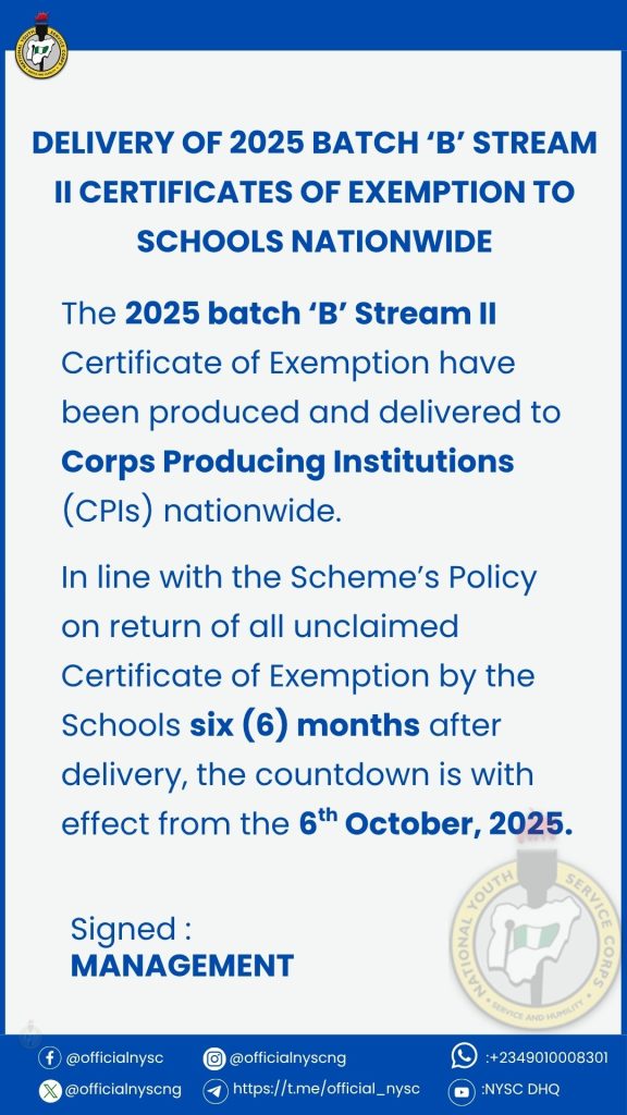 “The 2025 Batch ‘B’ Stream II Certificates of Exemption have been produced and delivered to Corps Producing Institutions (CPIs) nationwide. In line with the Scheme’s policy on the return of all unclaimed certificates by the schools six (6) months after delivery, the countdown is with effect from 6th October, 2025.”