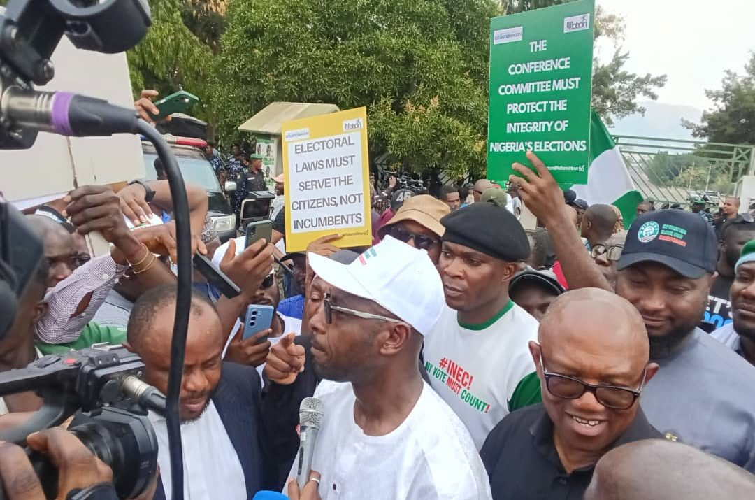 Former Anambra State Governor and Labour Party presidential candidate, Peter Obi, on Monday led protesters to the National Assembly in Abuja, opposing the Senate’s decision to reject mandatory electronic transmission of election results.