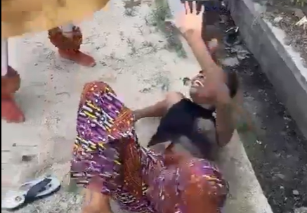 In the widely circulated video, a woman is seen on the ground near an open drainage channel, visibly distressed and screaming as she is struck repeatedly by a masquerade dressed in red and yellow attire. Despite attempts to shield herself and move away, the confrontation continues as onlookers stand nearby.