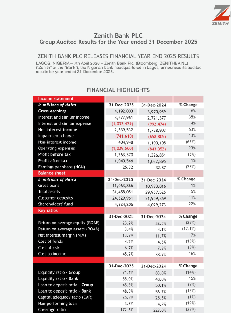 Zenith Bank Plc has once again delivered a standout performance, posting a ₦1.04 trillion profit after tax for the 2025 financial year and reinforcing its dominance in Nigeria’s banking sector.