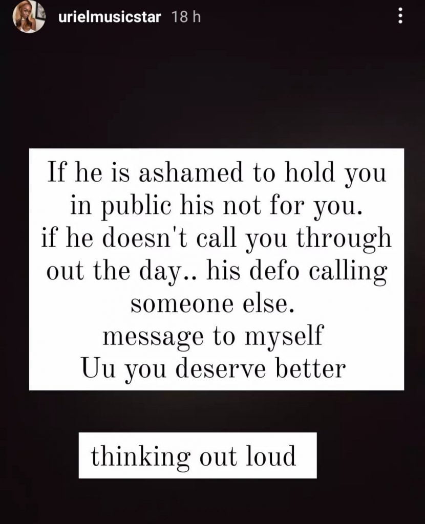 She wrote: “If he is ashamed to hold you in public, he’s not for you. If he doesn’t call you throughout the day… he’s defo calling someone else.”